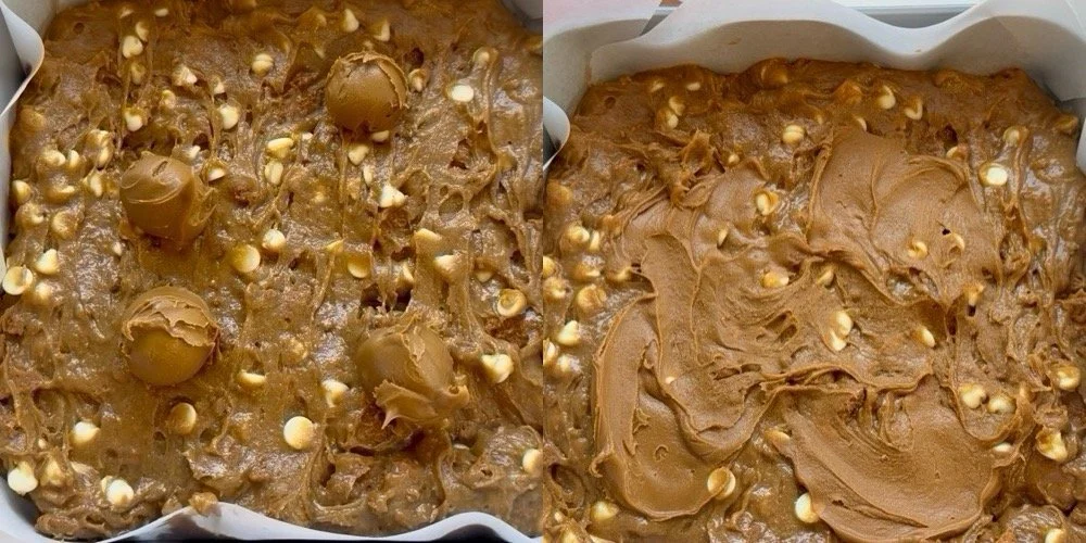 Spread the batter into your prepared pan. Add four small dollops of cookie butter on top and gently smooth them into the surface.