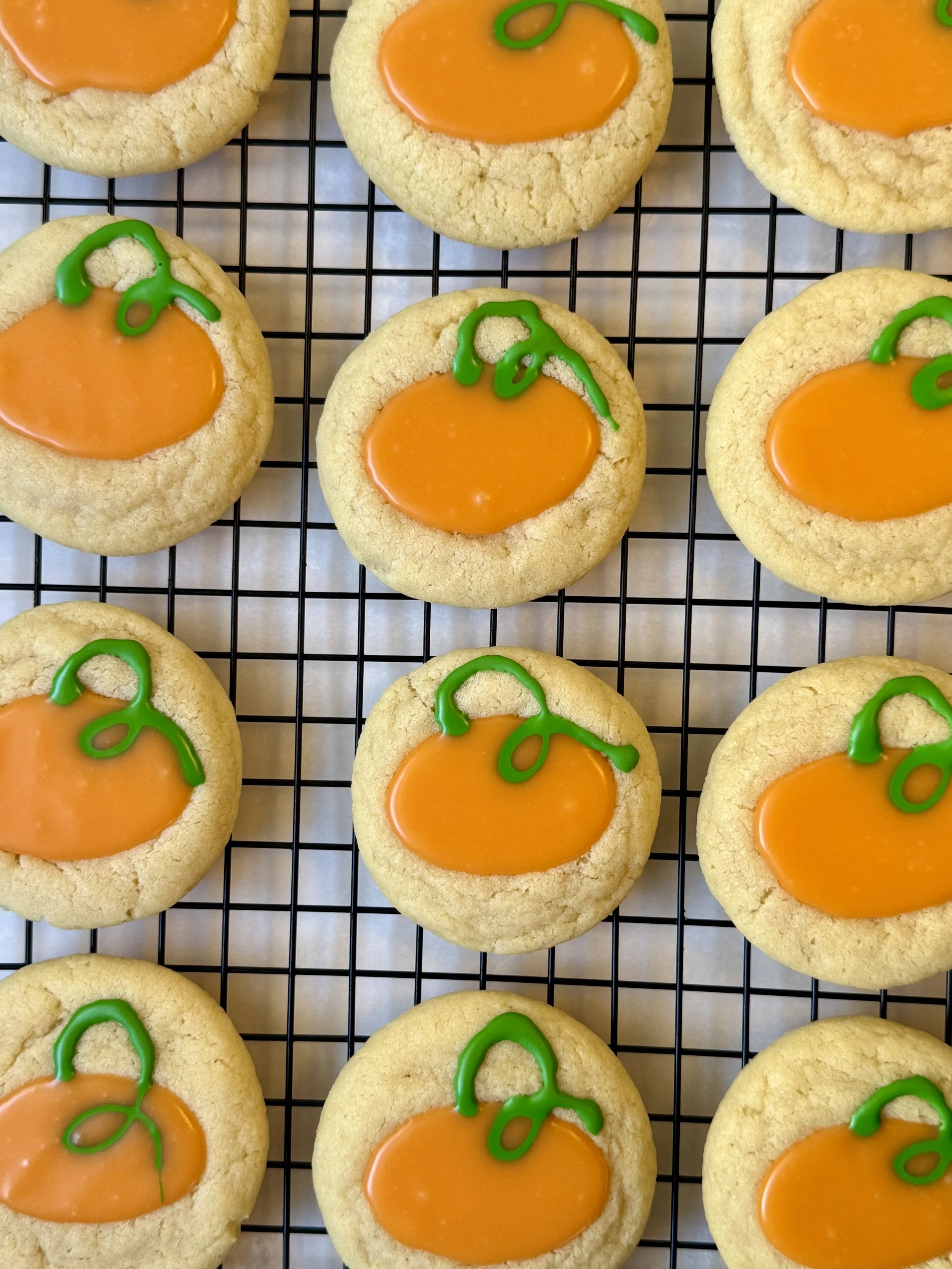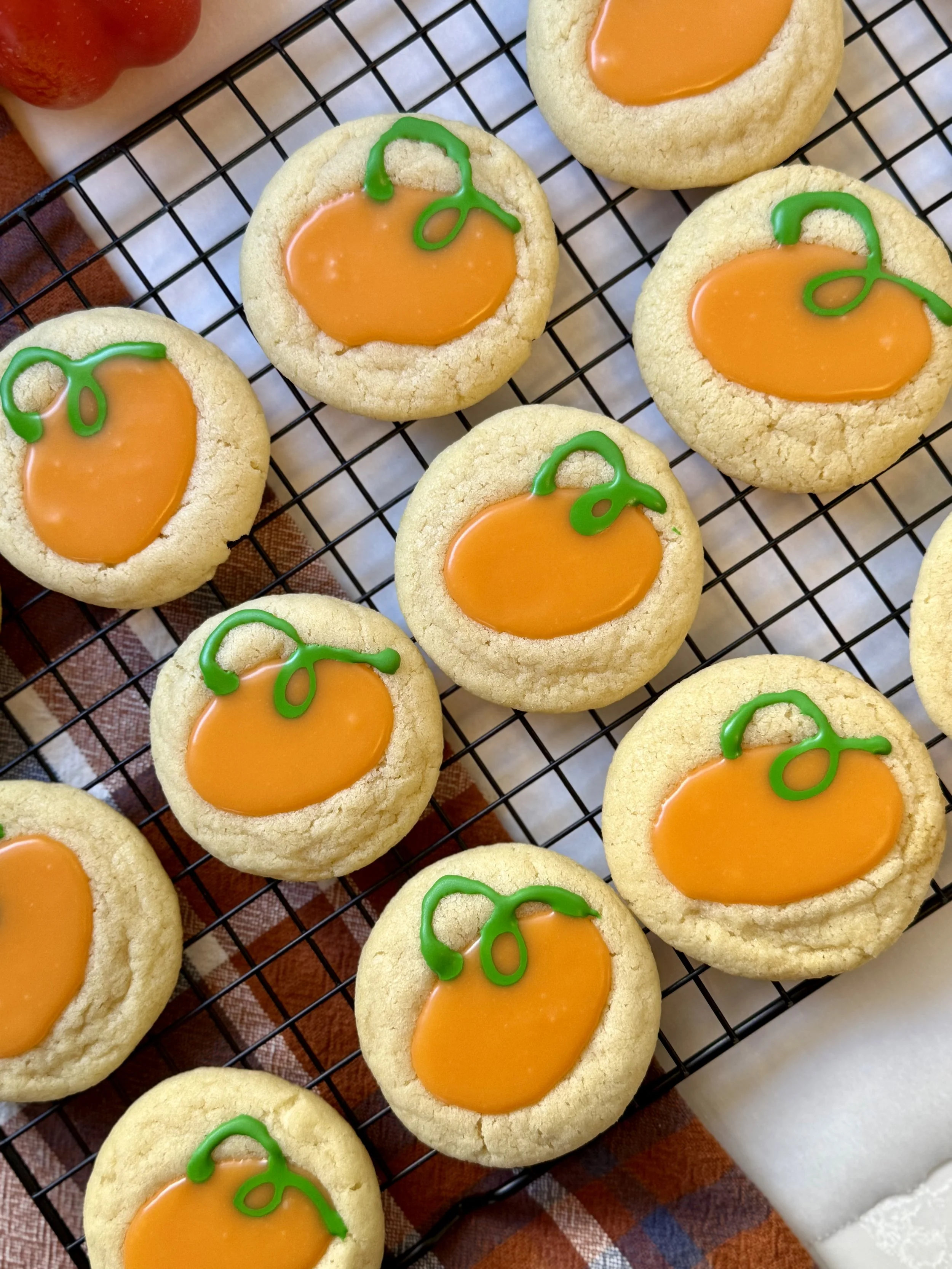 Creating the little pumpkin indents and swirling on a green royal icing “stem” makes these cookies as fun to look at as they are to eat.