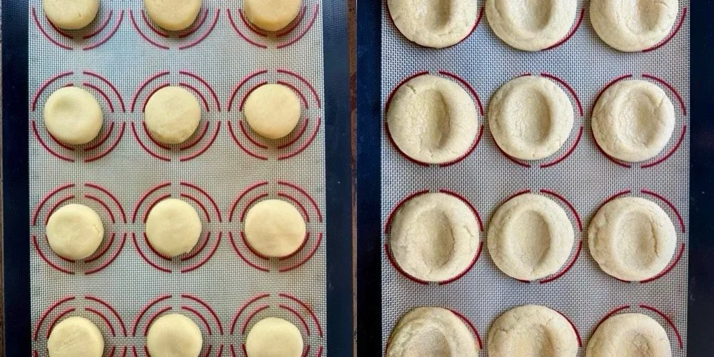 Right after taking the cookies out of the oven, while they’re still warm and soft, use the back of a small spoon to gently press an oval-shaped indent in the center of each cookie.