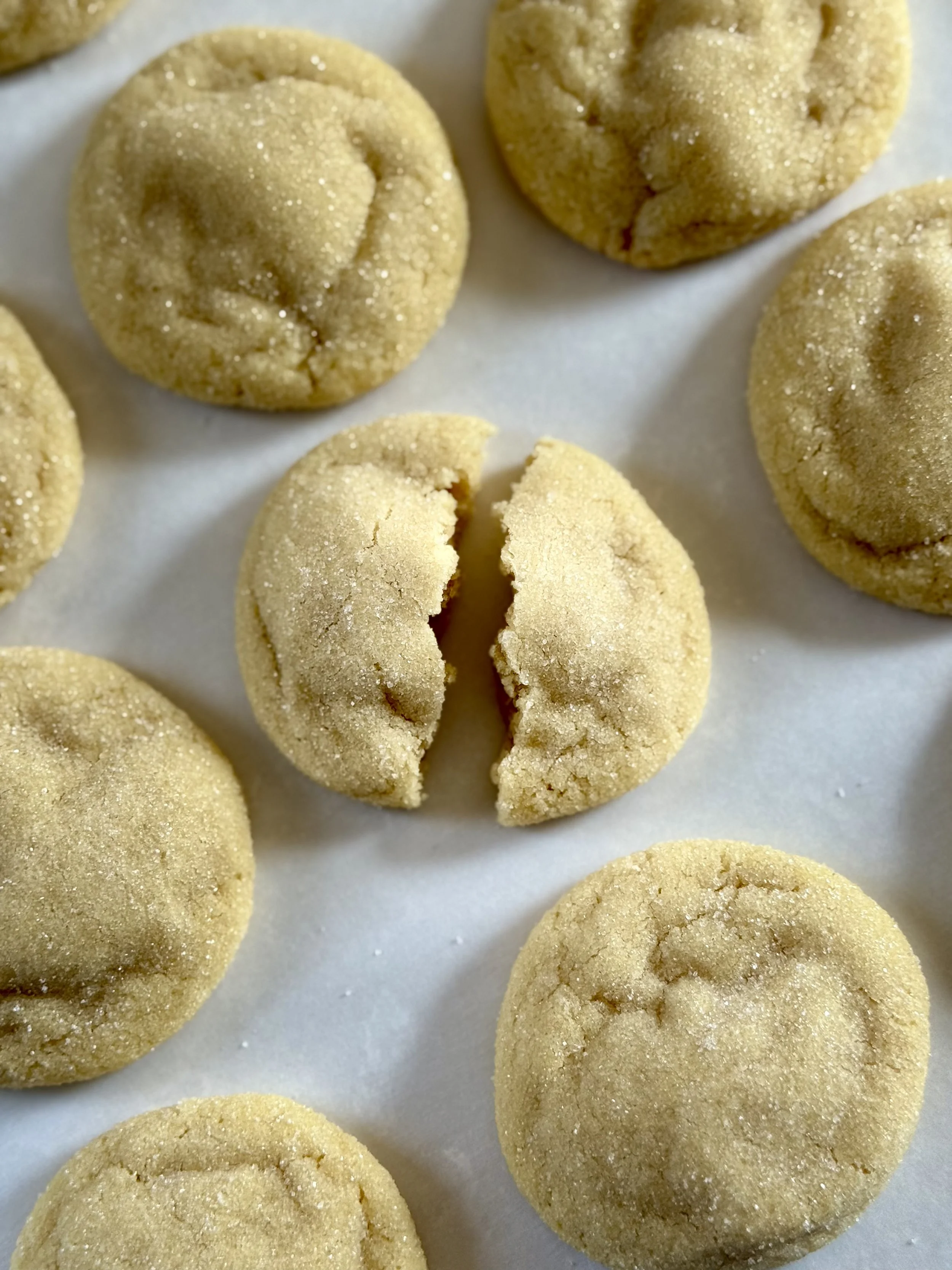 Using a medium cookie scoop or about 2 tablespoons of dough per cookie, roll the dough into balls. Roll each ball in the remaining ½ cup of granulated sugar.