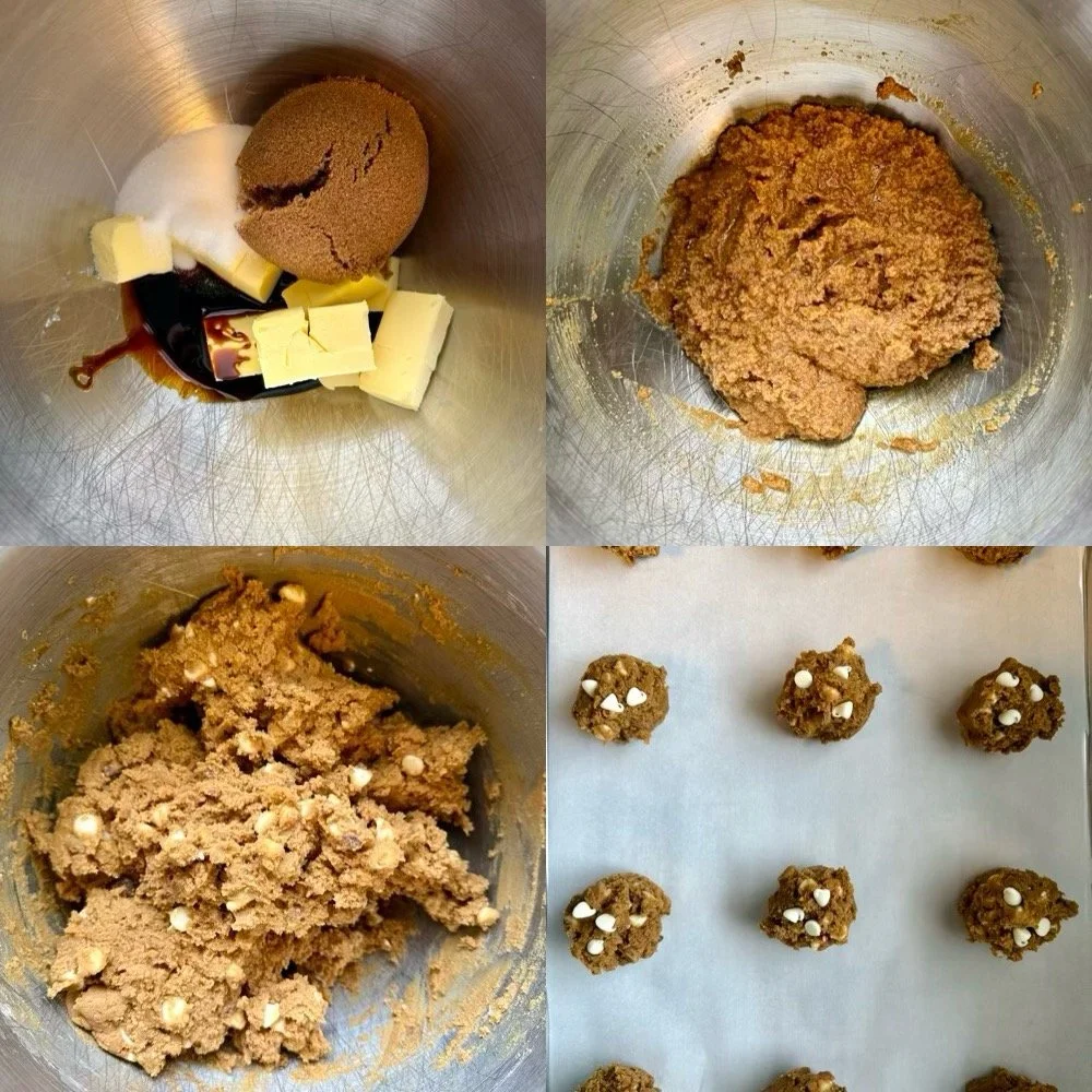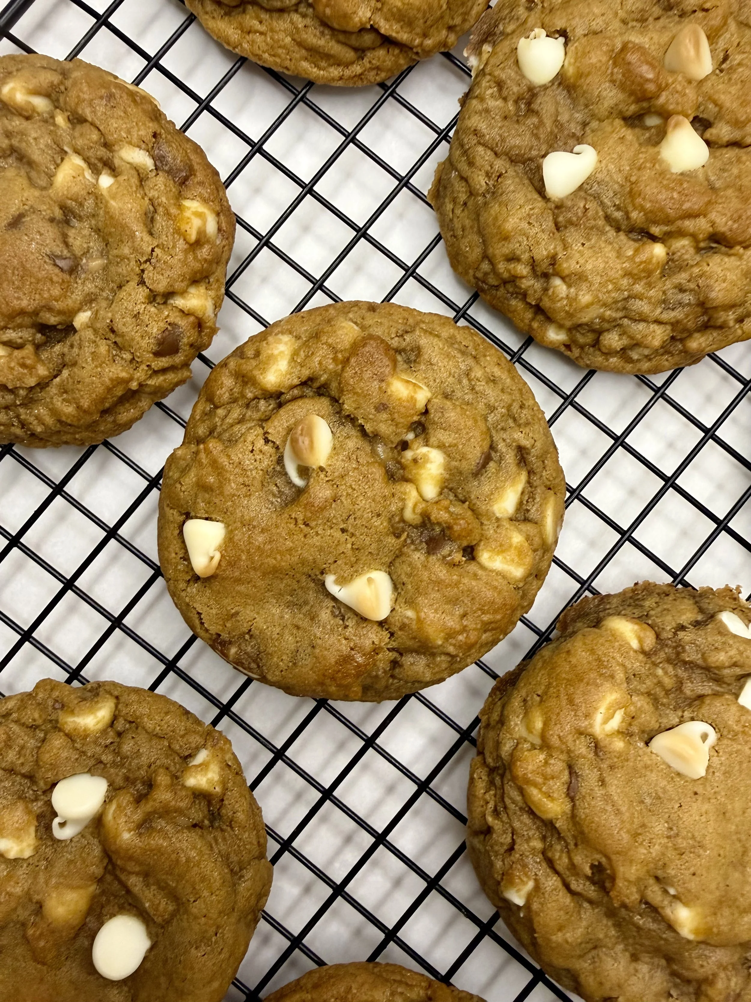 Keep the cookies thick: Use cold butter, avoid overmixing, and scoop the dough with the “chunky top” facing upward so the cookies stay tall and bakery-style.