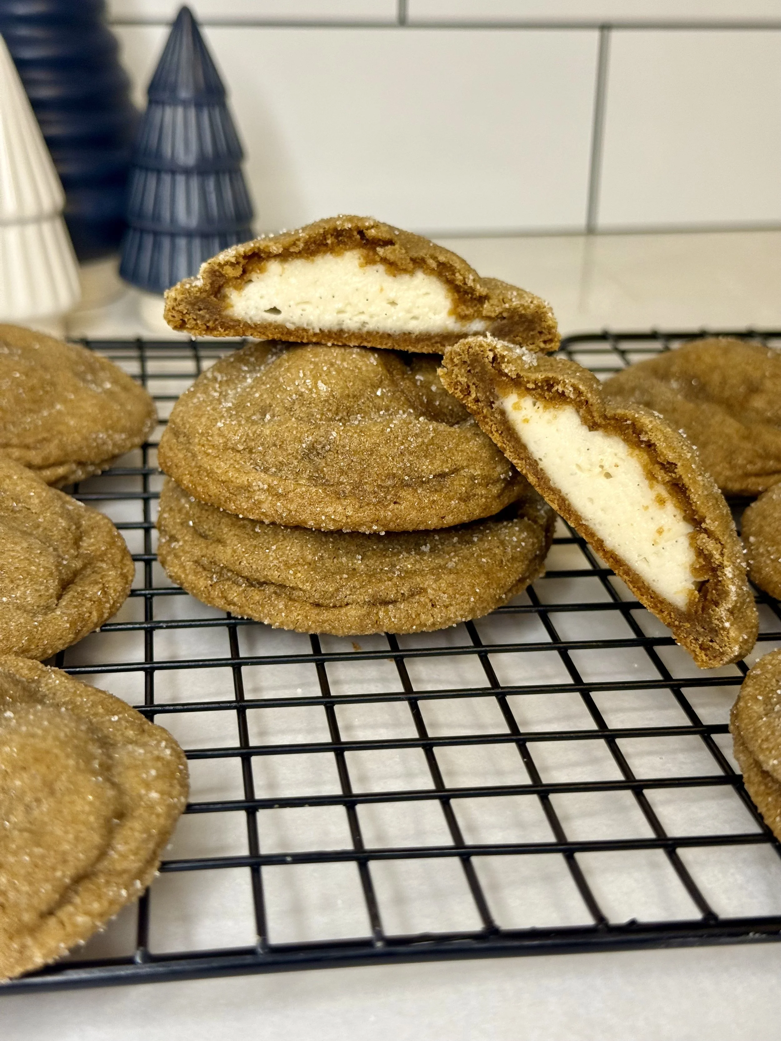 Soft, spiced gingerbread cookies wrapped around a creamy cheesecake-style filling, baked until perfectly cozy and indulgent. Each bite delivers warm holiday spices with a rich, tangy surprise at the center.