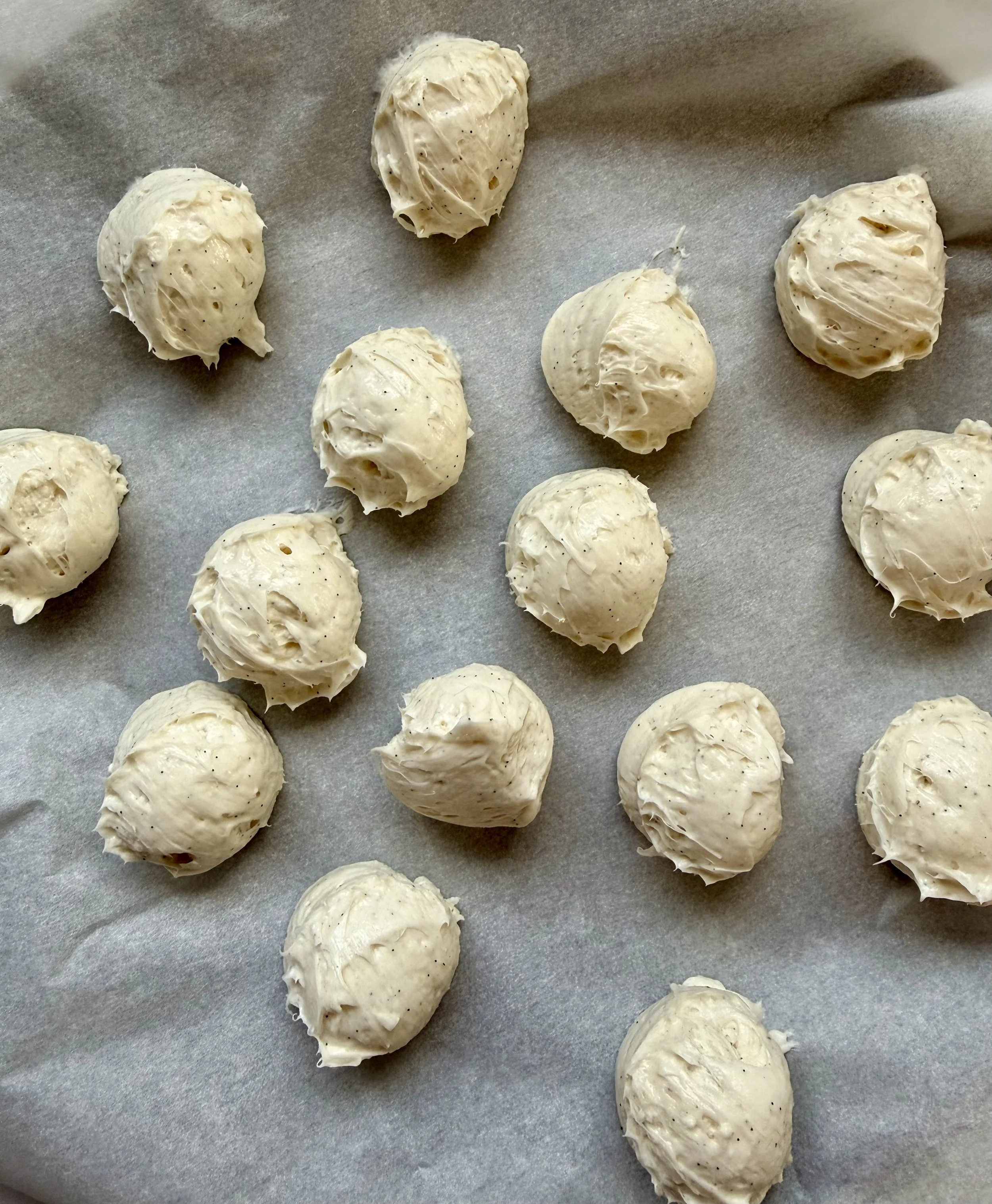 In a medium bowl, beat the cream cheese, sugar, and vanilla until smooth and creamy. Scoop into small portions using a small cookie scoop and place on a parchment-lined tray or container. Freeze for 2–4 hours, or until completely solid. This step is key to easy stuffing.
