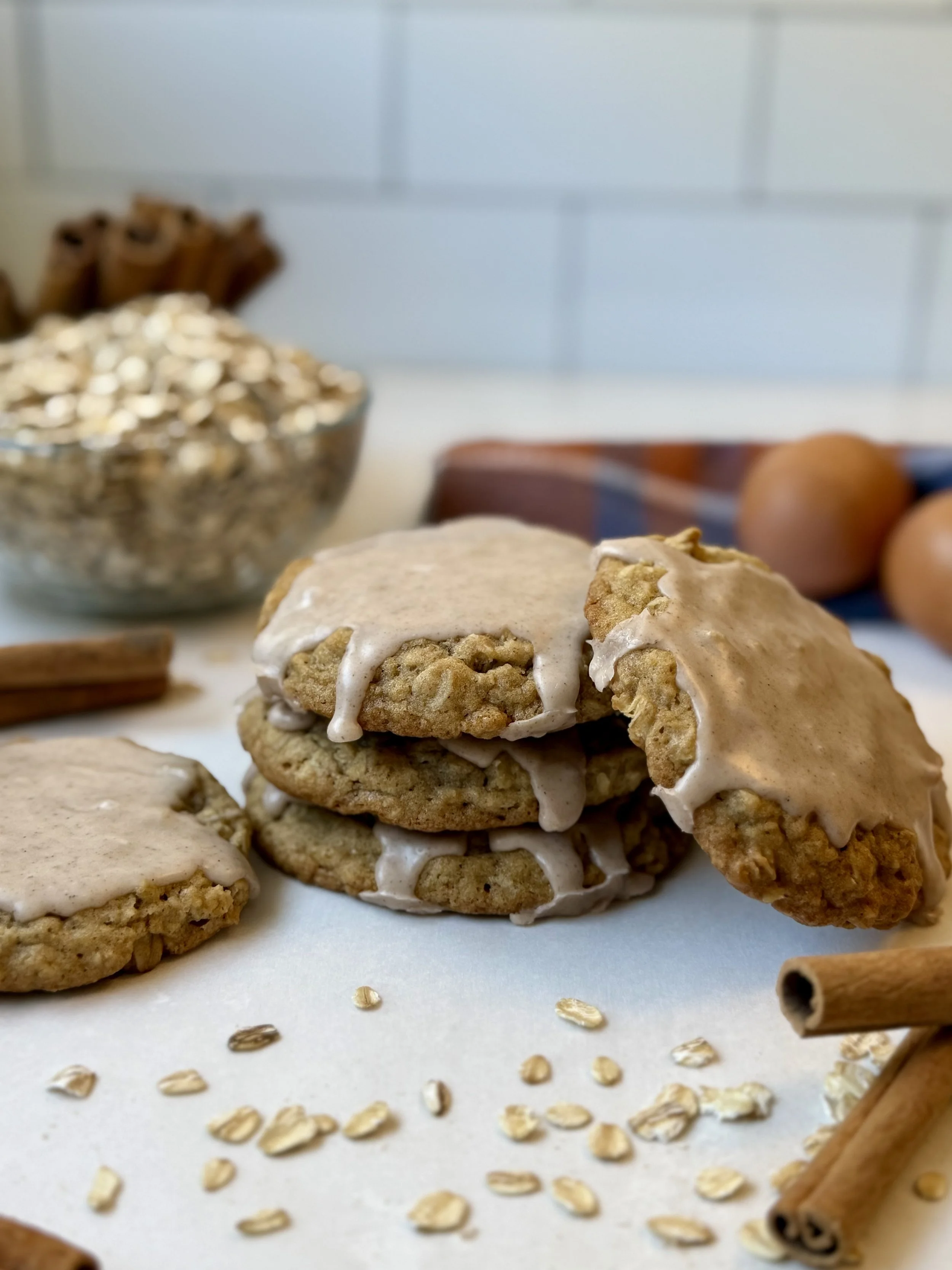 These iced oatmeal cookies combine nostalgic flavor with a touch of elegance. Perfectly soft, warmly spiced, and finished with a cinnamon glaze. Let me know your thoughts below if you make these!