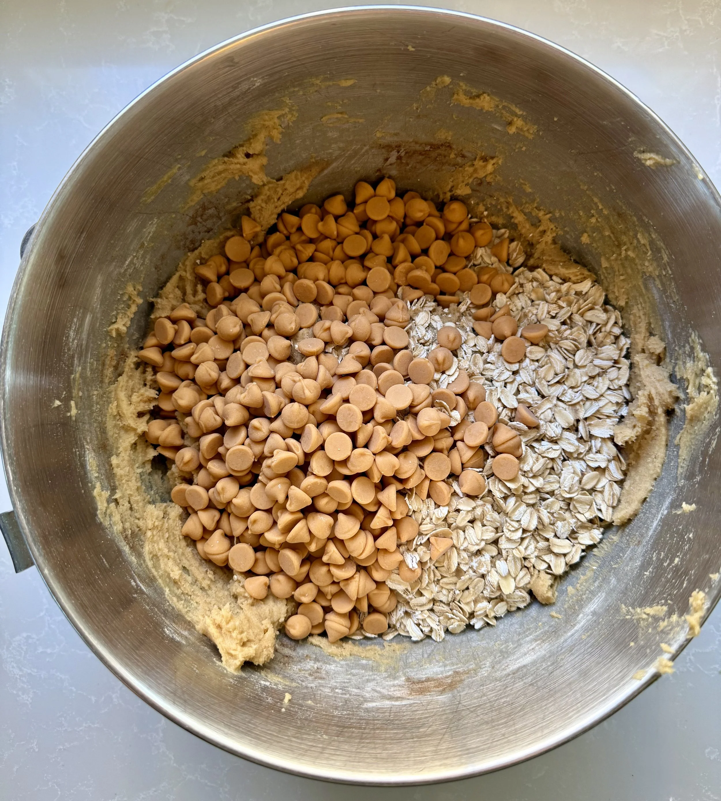 Add the cake flour, all-purpose flour, cinnamon, nutmeg, cornstarch, baking soda, and salt. Mix until just combined — do not overmix. The dough will be thick.Fold in oats and butterscotch chips