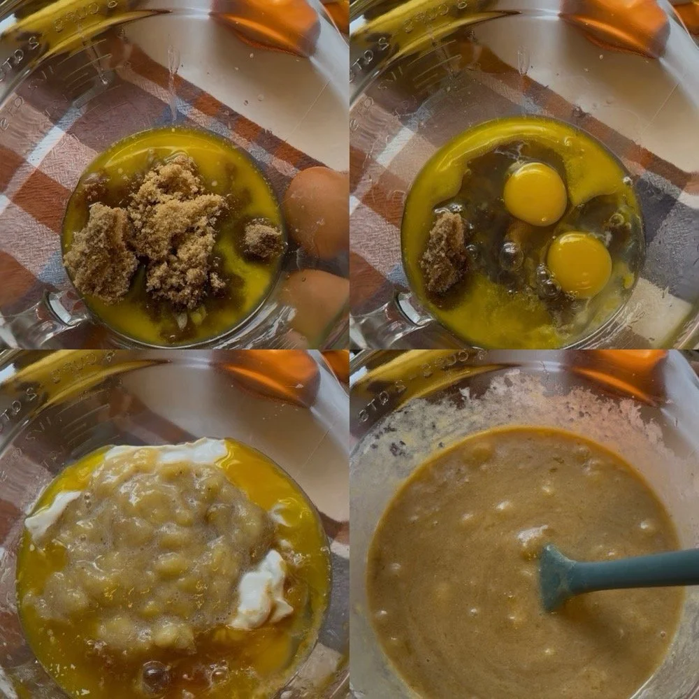 Melt 1 stick of butter and let it cool slightly. Add it to the mashed bananas, followed by: